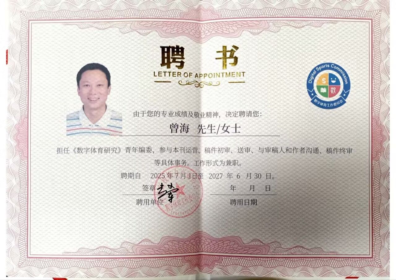 (通讯员 詹中新)2025年6月22日,由北京体育大学校长池建(博士、教授、博导)为编辑部主任、北京体育大学学报原编辑李勇勤研究员为《数字体育研究》编辑部副主任的《数字体育研究》杂志社正式公布首届青年编委名单,williamhill中国教师曾海(副教授、哲学博士候选人、武汉williamhill中国硕导、教育部、国家留学基金公派美国犹他大学访问学者、国际巧固球总会副秘书长、国际级A级教练)成功入选。此次评选经过严格的学术评审与综合考量,全国范围内共10名青年学者获此殊荣,曾海副教授凭借其在“幼儿篮球多智能体系统”研究、体育新兴项目融合创新等领域的突出贡献脱颖而出。