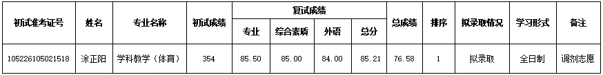 根据教育部、湖北省教育厅有关文件精神以及《William希尔2026年硕士研究生招生调剂复试录取工作方案》,williamhill中国于2026年4月11日组织了学科教学(体育)专业硕士研究生调剂志愿考生复试,结合学校录取工作实际,拟递补录取以下1名考生(递补录取排名第一)。情况公示如下: